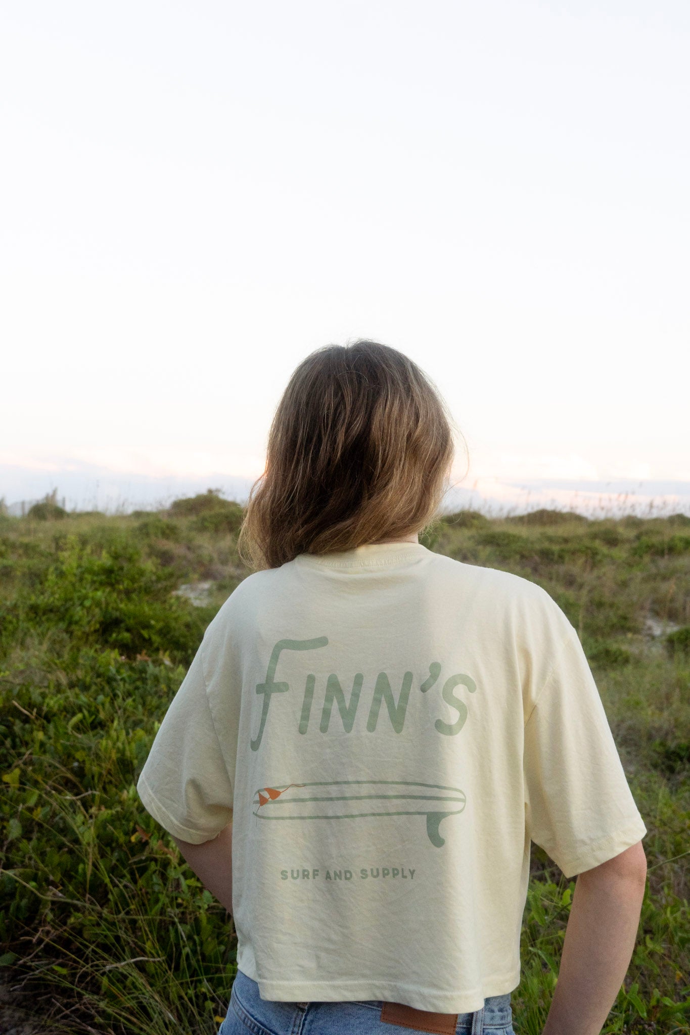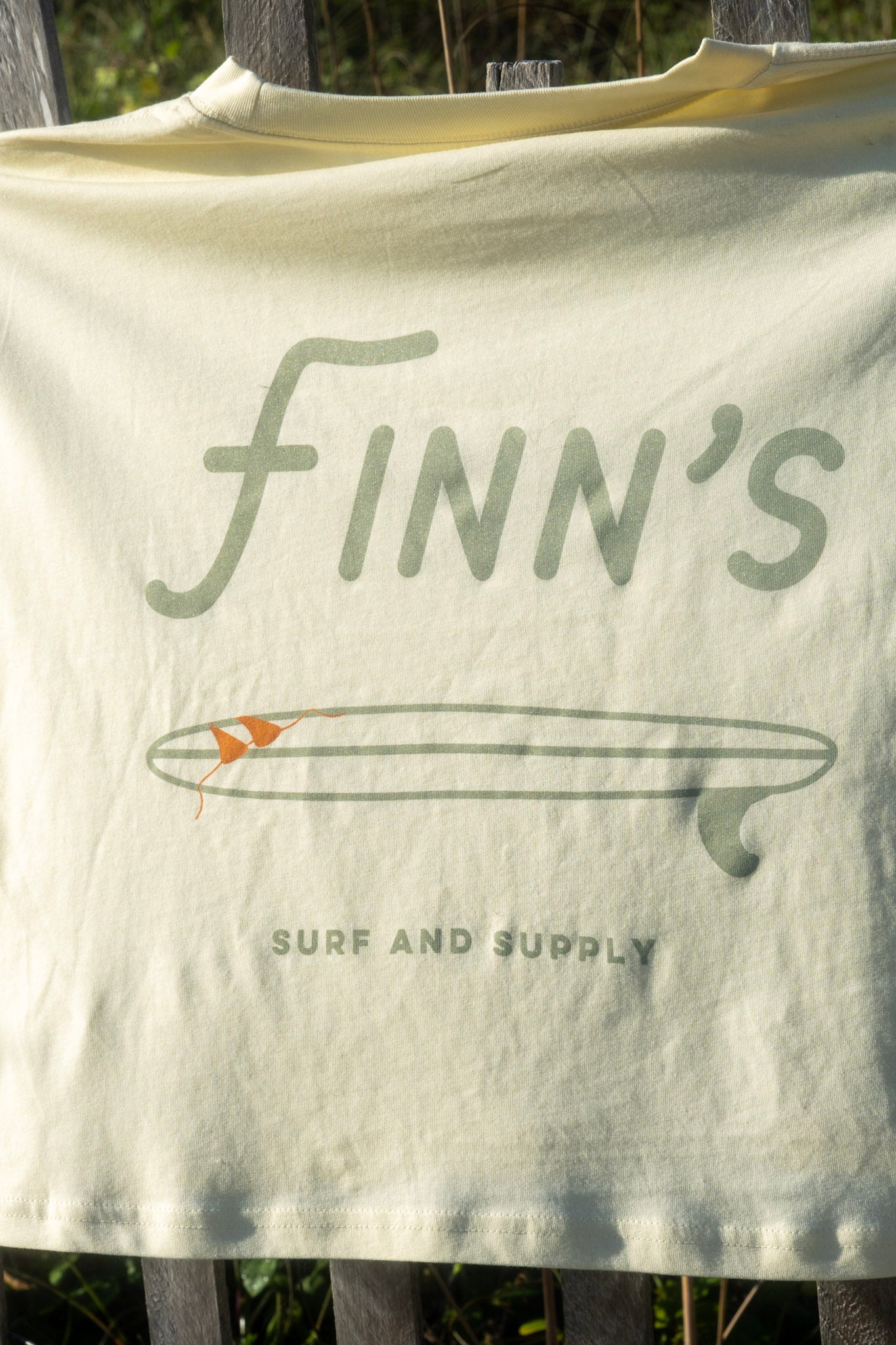 Inspired by laid-back surf style, this butter yellow cotton crop tee is designed with a slightly boxy fit for a unique, relaxed feel. The front features a bold orange print of a bikini and sun, bringing all the summer energy, while the back shows off our signature logo with a surfboard in a cool green.